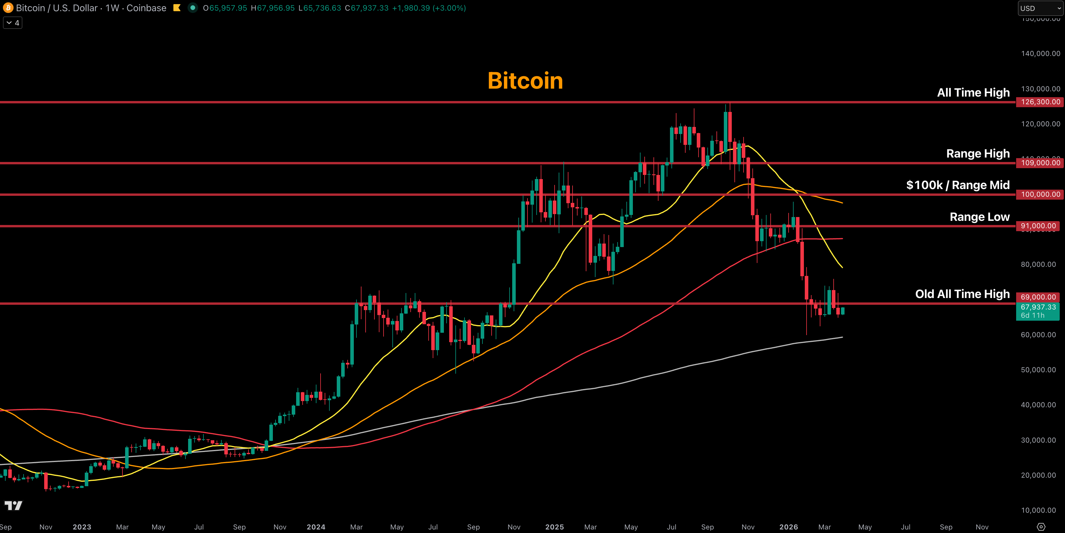 After another choppy week, Bitcoin closed its weekly candle just under $66k. This means that bitcoin has once again lost its major pivot level at $69k. However, given the selloff we have seen across asset markets over the past few weeks, Bitcoin has held up surprisingly well. All we can do for now is be patient and wait for the market to provide more clarity.