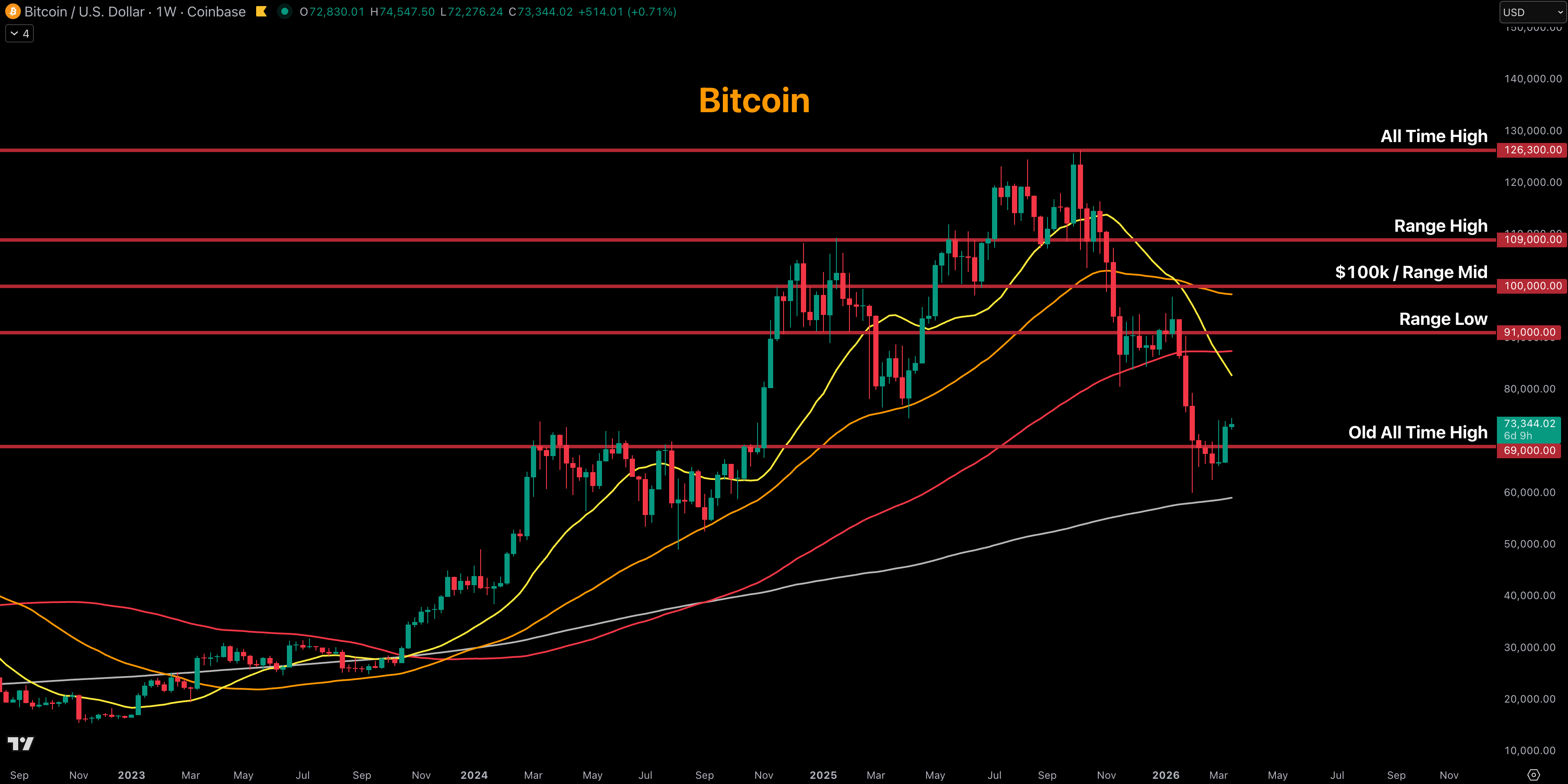 After another week of impressive resilience, Bitcoin closed its weekly candle just under $73k. This means that Bitcoin closed back above our major pivot level of $69k. Bitcoin continues to show impressive strength even with all the geopolitical uncertainty impacting traditional markets. Now we just want to see Bitcoin maintain above $69k so that we can head higher and continue our relief rally.